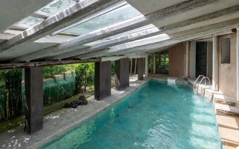 La villa si estende su 300 m² distribuiti su 2 livelli e accoglie fino a 12 ospiti in 6 camere da letto e 6 bagni. Al piano terra, l'ingresso principale introduce a una sala da pranzo di ampia metratura con camino a focolare aperto, seguita da una cucina completamente attrezzata con 4 fuochi, forno, lavastoviglie, microonde e congelatore, oltre a un WC separato. Su questo livello sono presenti 2 camere da letto matrimoniali, una di proporzioni standard e una di dimensioni notevolmente maggiori, ciascuna dotata di doccia privata, bidet e WC. Il primo piano è caratterizzato da una zona di passaggio che collega gli spazi con facilità. Qui si trovano 2 ulteriori camere da letto matrimoniali, ognuna con doccia, bidet e WC privati, e una terza camera da letto matrimoniale con soffitti inclinati e dotata di doccia, bidet e WC. Un ampio soggiorno con finestra panoramica e camino a focolare aperto occupa questo livello, con accesso diretto a una terrazza di 30 m² parzialmente coperta e arredata. Accessibile tramite scala a spirale, una galleria ospita il sesto spazio notte, composto da un letto matrimoniale con doccia, bidet e WC privati. Una cucina aperta su questo livello è equipaggiata con 4 fuochi e forno, affiancata da un tavolo da pranzo. Pavimenti in pietra naturale e legno caldo caratterizzano l'intera proprietà.