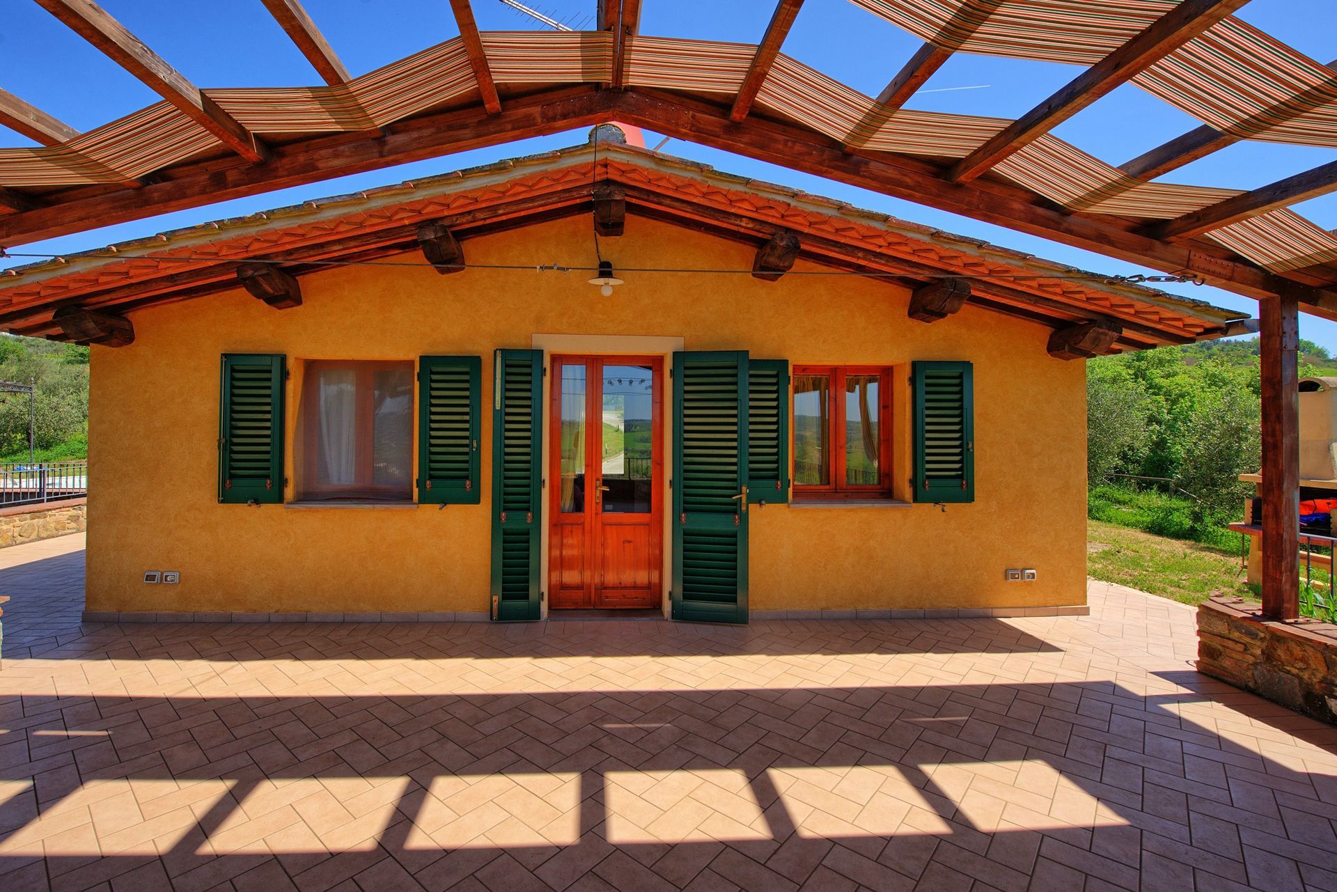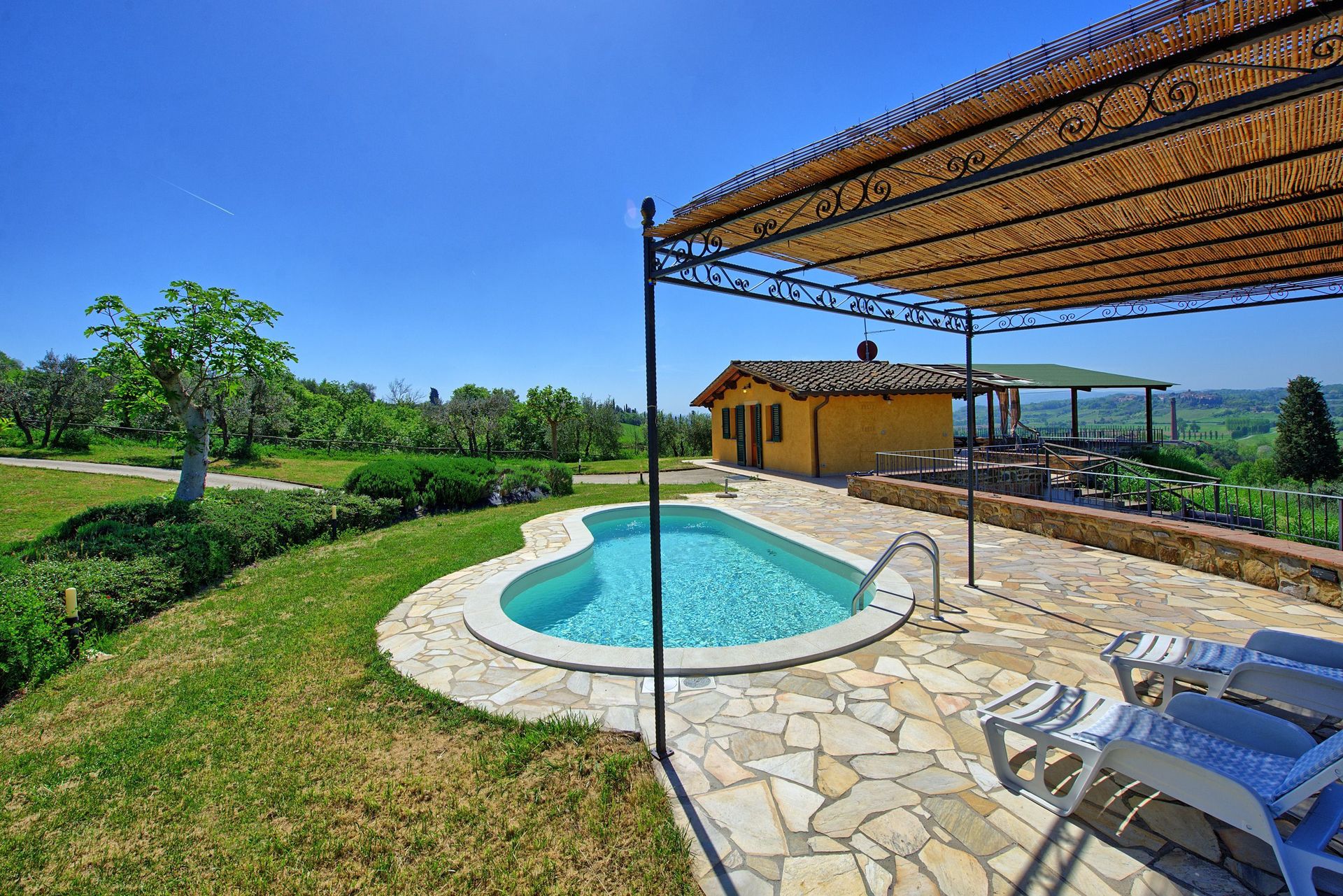 A disposizione degli ospiti: giardino attrezzato con piscina riservata all’uso esclusivo degli ospiti (a forma di fagiolo, 7 x 3 m circa - profondità 1,2 m - aperta dal 01/04 al 30/10), barbecue, ampia terrazza attrezzata con gazebo, tavolo e sedie per mangiare all’aperto e con bella vista panoramica che spazia dal Monte Serra alle torri di San Gimignano.