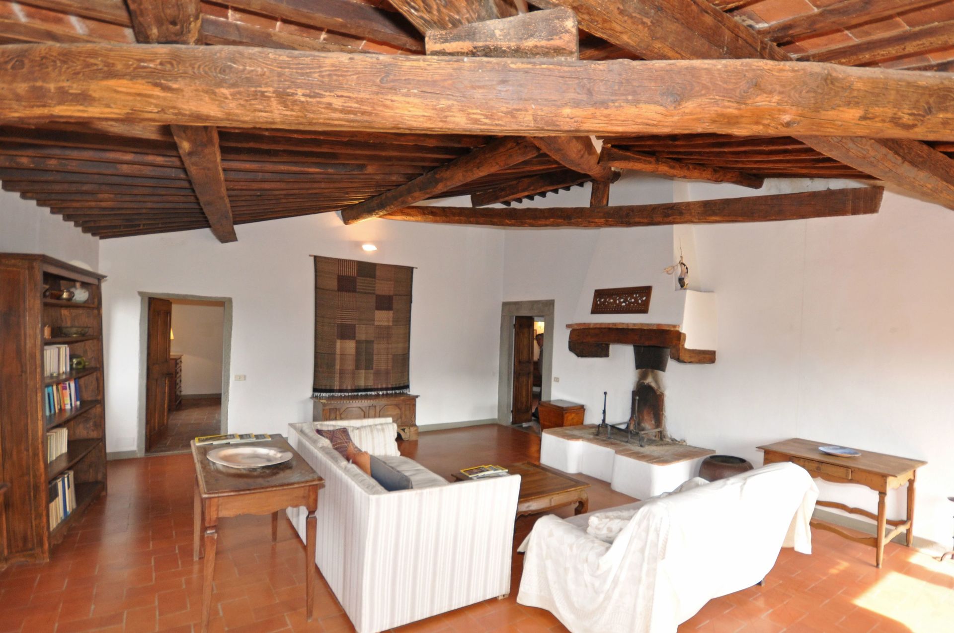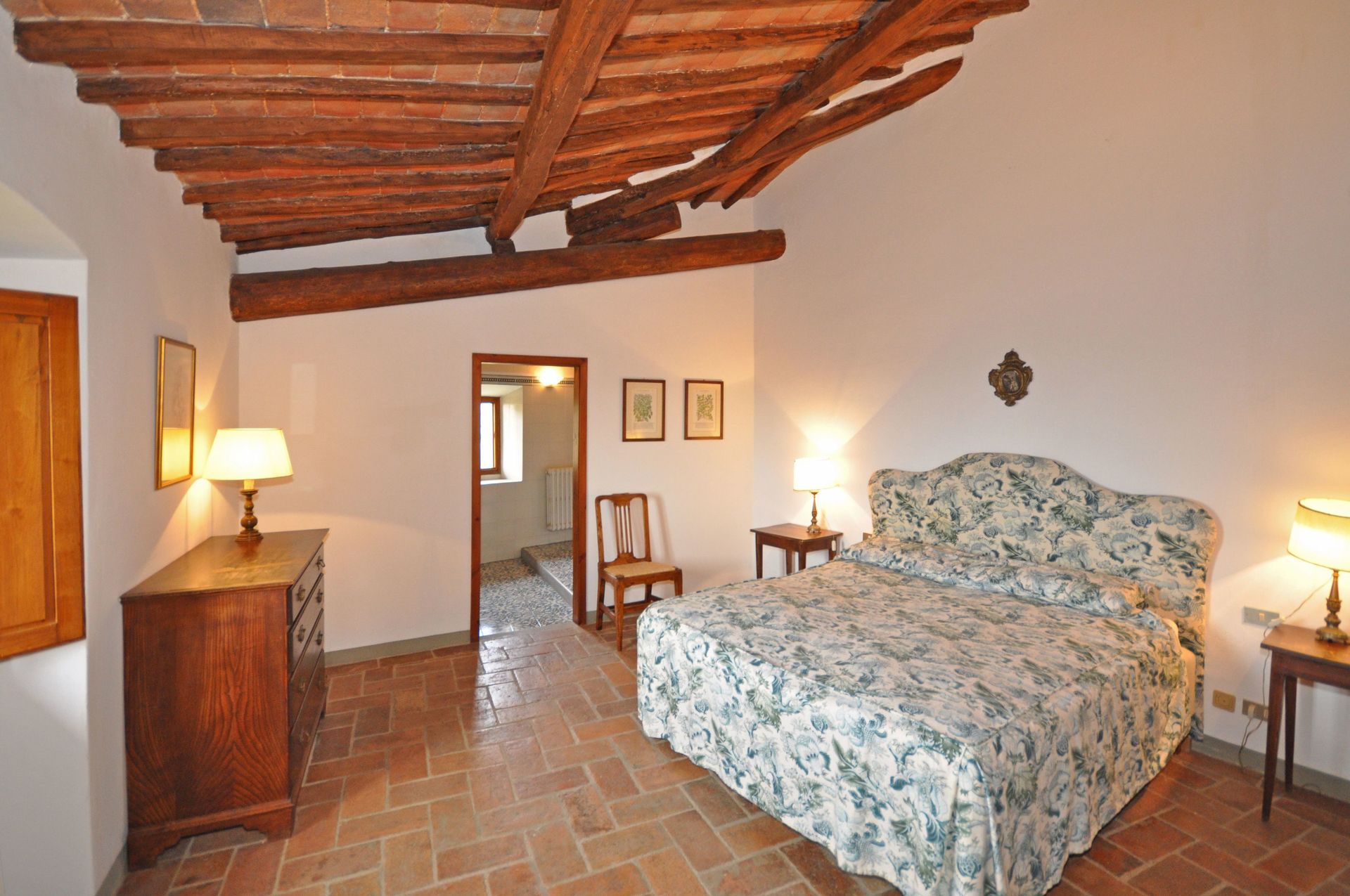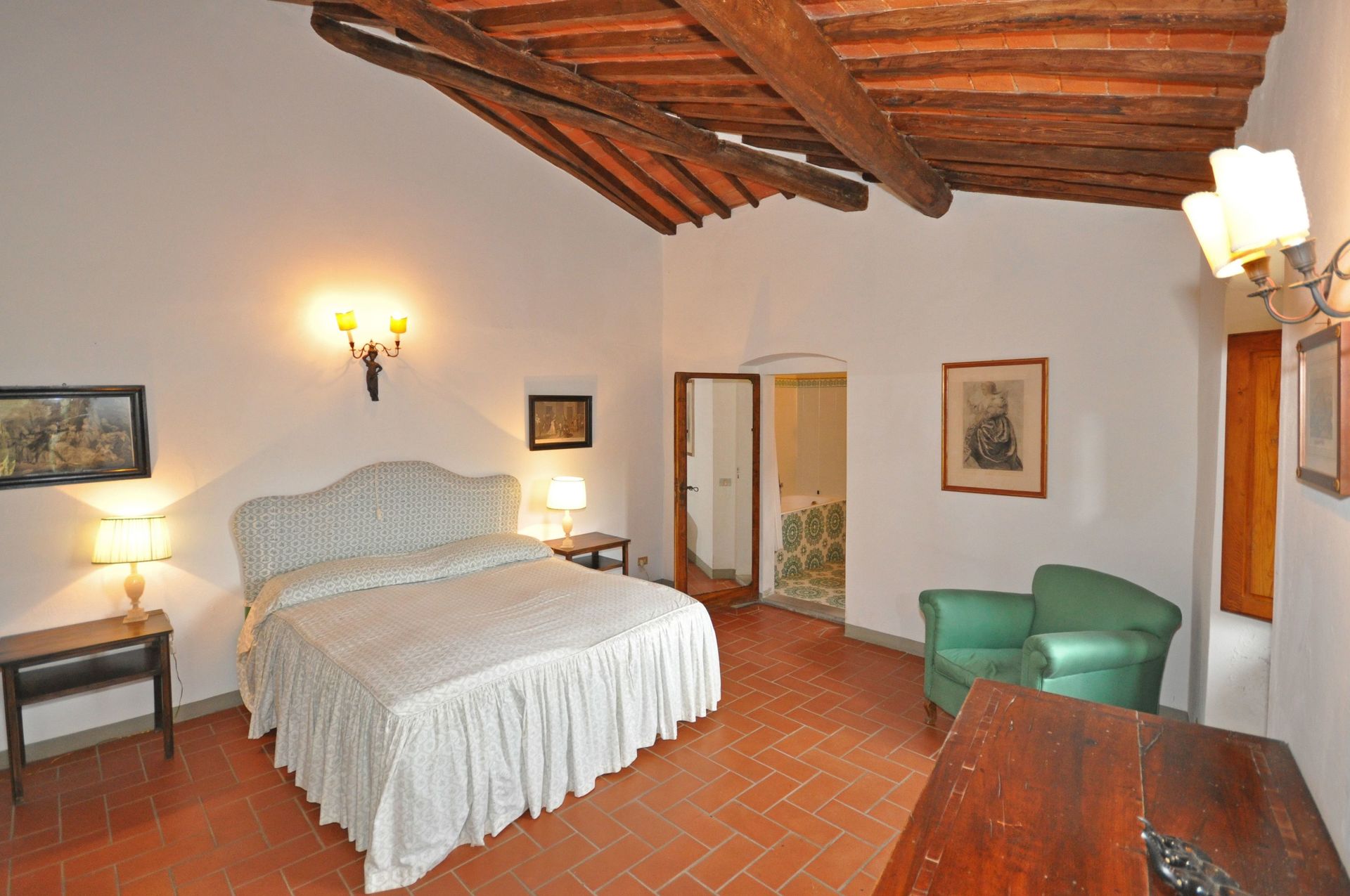 1° Piano: ampio soggiorno con camino e accesso ad una grande terrazza, camera con letto matrimoniale a baldacchino e bagno privato con vasca, camera con 2 letti singoli e bagno privato con vasca, studio con TV satellitare.