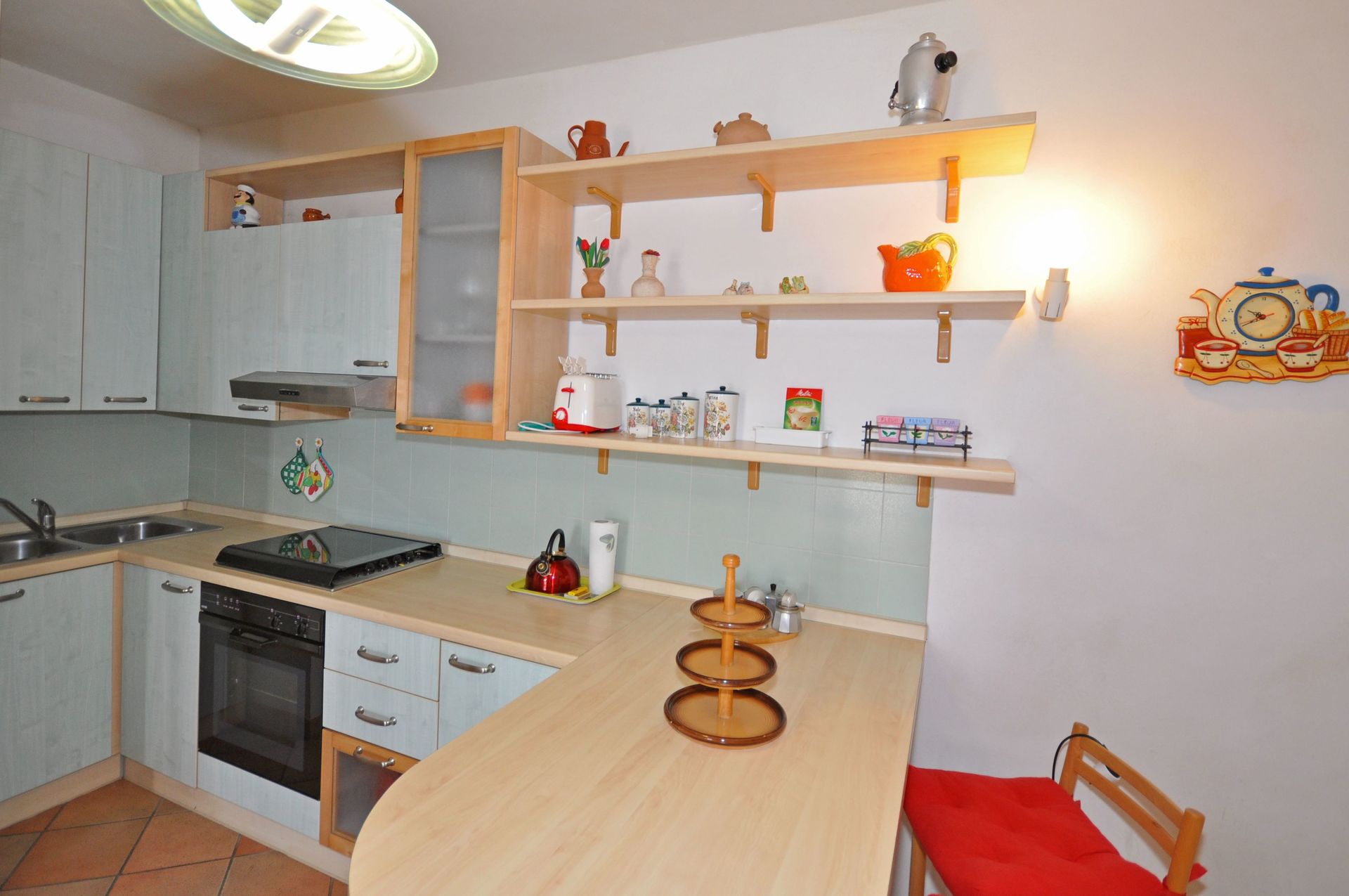 Piano terreno (accessibile sia dall'interno tramite una scala a chiocciola sia dall'esterno): soggiorno con divano letto matrimoniale e angolo cottura (forno), camera matrimoniale (aria condizionata), bagno con doccia, ripostiglio con lavatrice.