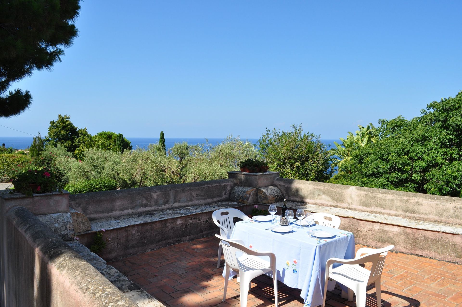 una con accesso sul giardino con 2 letti singoli) due bagni (uno con doccia l'altro con vasca e doccia) il terrazzo con vista sul mare e sul giardino per cenare sotto le stelle.